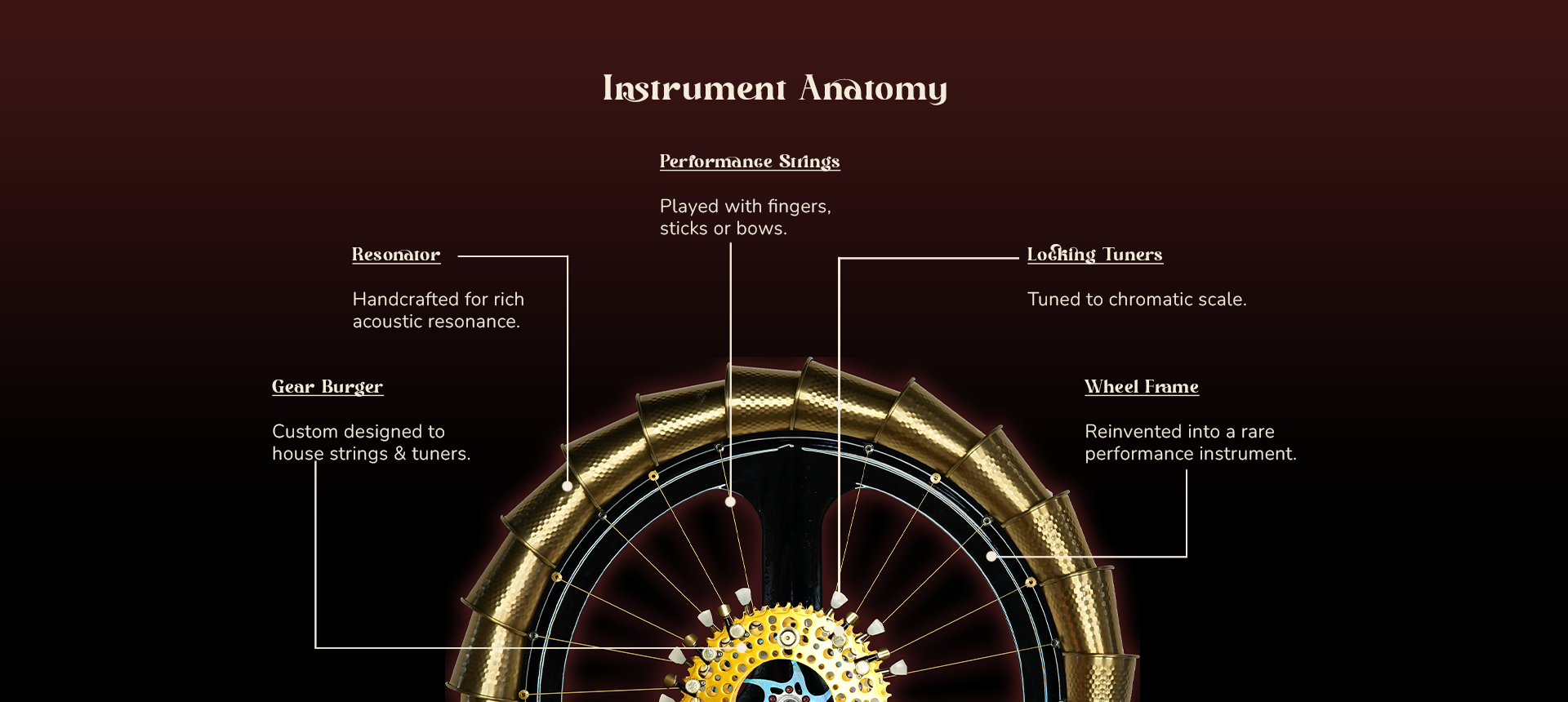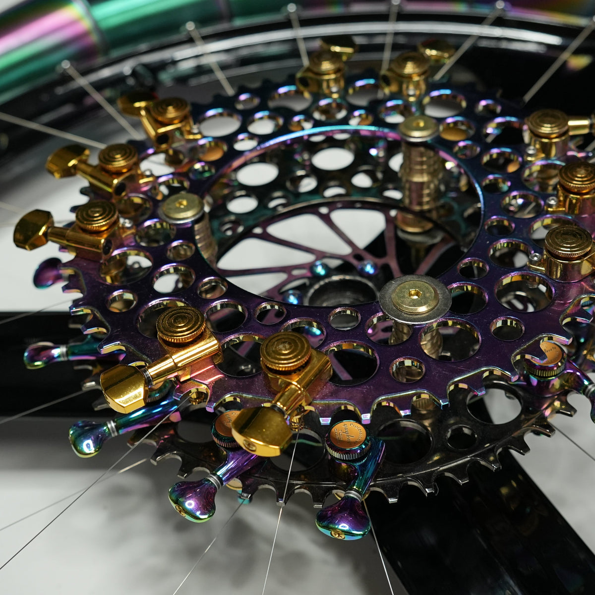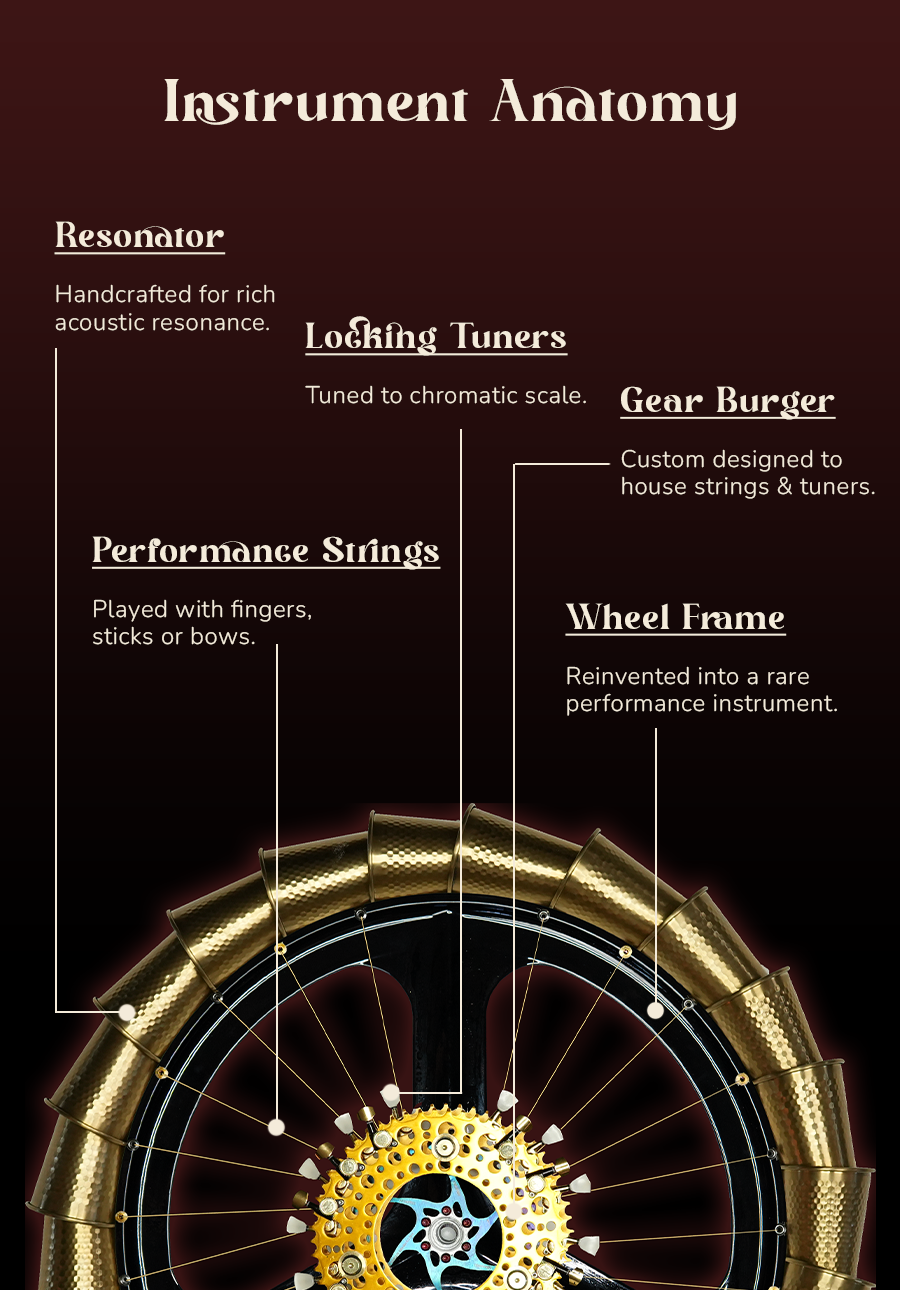 Discover a sound that no one else has. The Lethelium is a handcrafted 24-string chromatic instrument forged from a bicycle wheel & transformed into a rare performance tool.